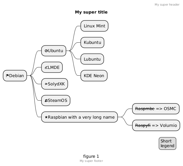 <uml> @startmindmap caption figure 1 title My super title * <&flag>Debian ** <&globe>Ubuntu *** Linux Mint *** Kubuntu *** Lubuntu *** KDE Neon ** <&graph>LMDE ** <&pulse>SolydXK ** <&people>SteamOS ** <&star>Raspbian with a very long name *** <s>Raspmbc</s> => OSMC *** <s>Raspyfi</s> => Volumio header My super header endheader center footer My super footer legend right Short legend endlegend @endmindmap </uml>