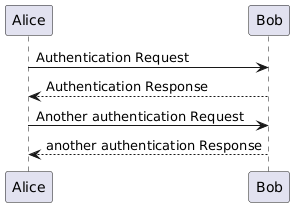 <uml> Alice -> Bob: Authentication Request Bob --> Alice: Authentication Response Alice -> Bob: Another authentication Request Alice <-- Bob: another authentication Response </uml>
